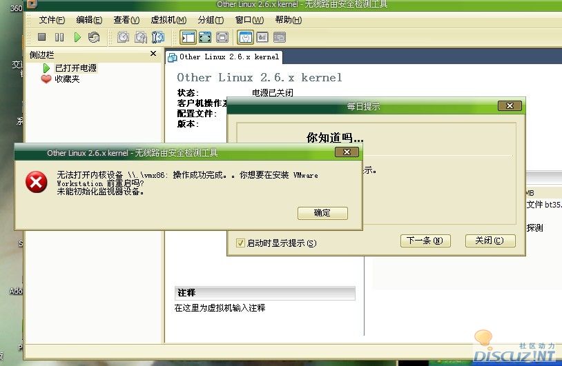 后面的图是你装了其它虚拟机产生了冲突,如果是我们的客户,请严格按照说明书上的顺序进行操作,大光盘里只需要安装无线路由安全检测工具就可以了,如果您自行再安装盘里的其它的软件就会产生冲突